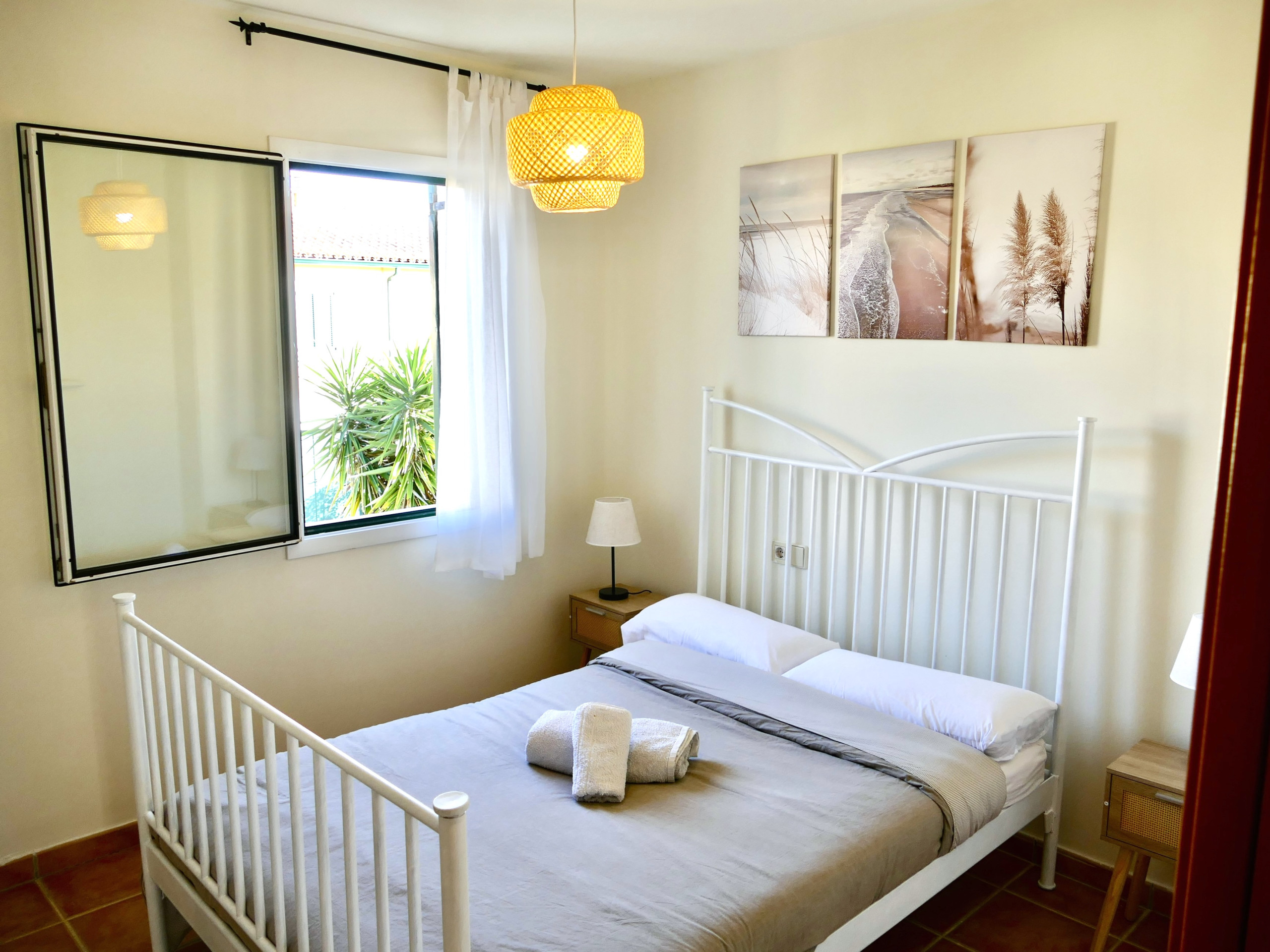 – 1 suite principal con cama de matrimonio (160×200 cm), baño privado con bañera y balcón.